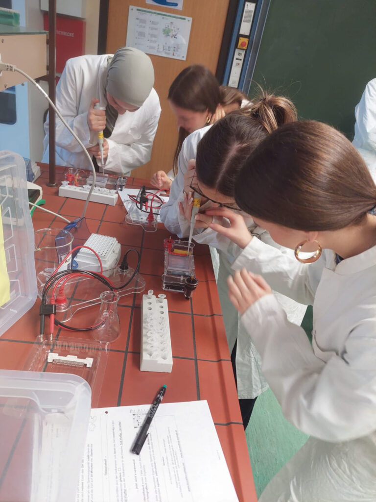 Nach einer kurzen Einführung ging es direkt an die Laborarbeit. Zunächst lernten die Schülerinnen und Schüler den Umgang mit Pipetten. Dabei war viel Konzentration und ein ruhiges Händchen gefragt, denn beim Pipettieren kommt es auf höchste Genauigkeit an.