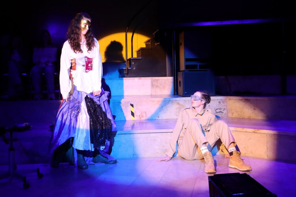 Ben Viktorin überzeugte in der Rolle des Beckmann als unglücklicher, verzweifelter Soldat, der mit seiner inneren Zerrissenheit und dem Verlust jeglicher Hoffnung kämpft. Auch die Rollen von Davide Meola, der sowohl Gott als auch den Einbeinigen darstellte, sowie Mike Depperschnmidt, der als Tod und Offizier auftrat, waren äußerst vielschichtig. Lucie Henkes und Sophia Nickel präsentierten als die Elbe und das Andere eindrucksvoll die ungreifbaren, metaphorischen Aspekte des Stücks und verliehen den symbolischen Figuren eine klare Identität.Besonders gelungen war auch der Kontrast zwischen den Figuren der realen Welt und den symbolischen Darstellungen. Clara Acuna Alonso als Kabarettdirektorin und Anna Boban als Frau Kramer waren überzeugend als Figuren des Alltags, während Arina Romfeld als Mädchen eine tragische Unschuld verkörperte.