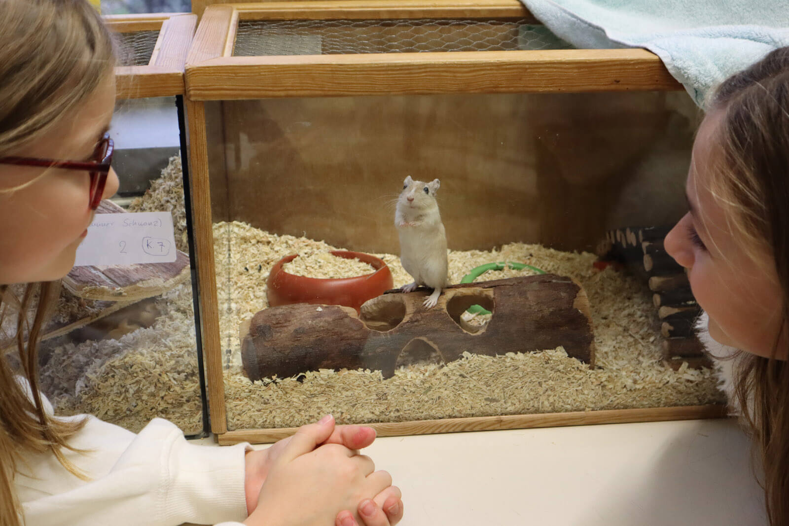 Sie Schüler*innen der Bio-AG versorgen die Tiere eigenverantwortlich in der Mittagspause. Sie pflegen, versorgen und füttern sie und dann bleibt immer noch genügend Zeit, die Rennmäuse zu beschäftigen. Das ist bei Rennmäusen sehr wichtig. Dazu wird regelmäßig der Käfig umgestaltet, neue Klettergeräte eingestellt und das Futter so geschickt versteckt angeboten, dass sie lange damit beschäftigt sind, an das Futter zu gelangen, um es dann genüsslich zu verspeisen.