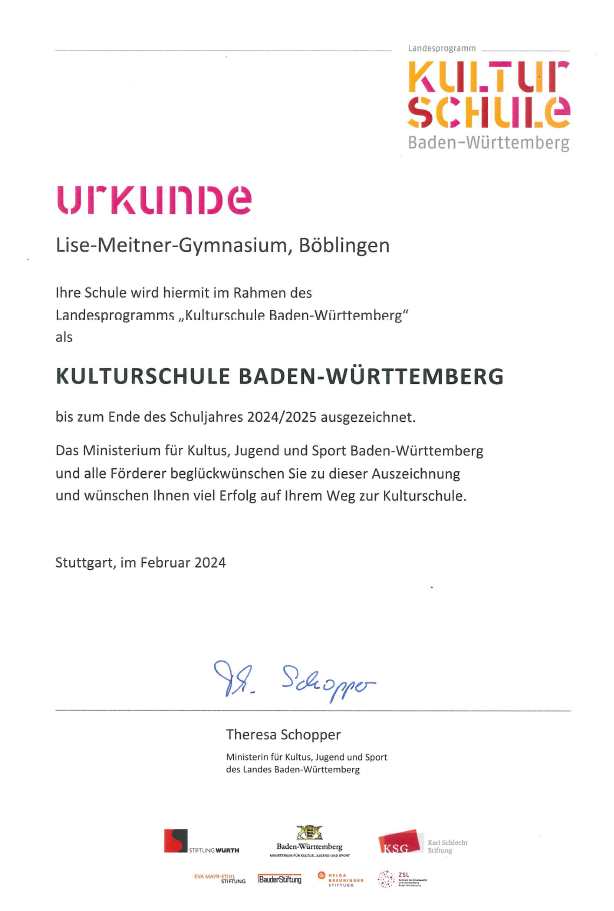 Mittlerweile ist das Lise-Meitner-Gymnasium als Pilotschule im Landesprogramm „Kulturschule Baden-Württemberg“ anerkannt. Damit übernimmt das LMG eine Vorreiterrolle in der kulturellen Schulentwicklung und dient anderen Schulen im Land als Inspiration und Orientierung.